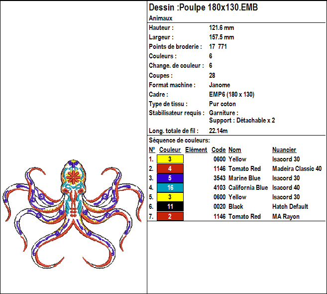 Fichier broderie machine représentant un poulpe multicolores, 180x130