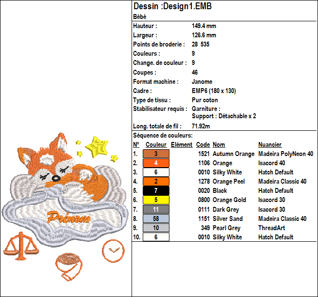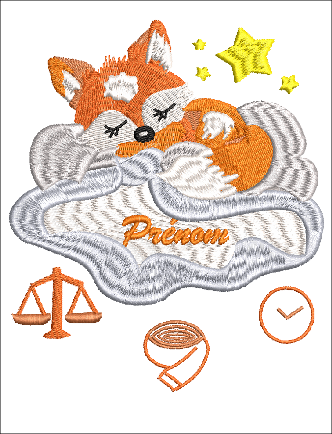 Ce motif de broderie machine représente un tableau de naissance un renard sur son nuage, pour la naissance d'un bébé fille ou un bébé garçon. Il a été conçu pour offrir un rendu élégant, précis et professionnel.