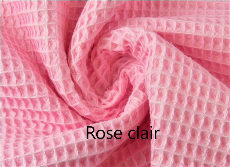 Nid d'abeille 100% coton. Coloris rose clair. Laize: 150 cm, poids: 230g/m². Caractéristique : Certifié Oeko-tex.